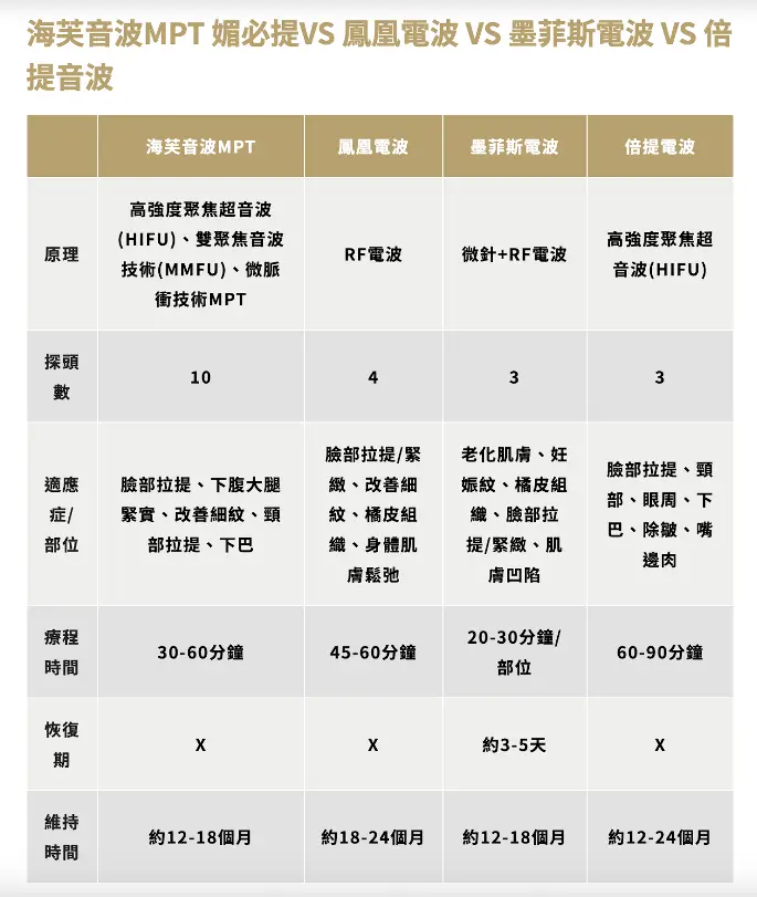 海芙音波第四代媚必提 (HIFU MPT) 是2023年推出的新型醫美療程,使用高能聚焦超音波技術,將熱能精準傳送至肌膚深層,幫助刺激膠原蛋白增生。這項療程能改善臉部鬆弛、下垂問題,還能重塑輪廓,讓效果更自然,且術後1到3個月內效果會持續顯現。